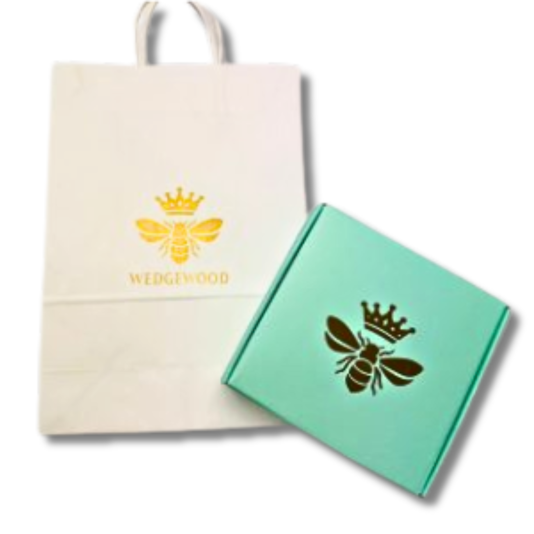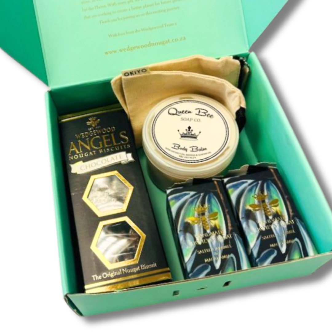 Wedgwood nougat choc biscuits, salted caramel and macadamia nougat x2, queen bee body balm, hand and heel balm, branded vanity bag and gift bag.